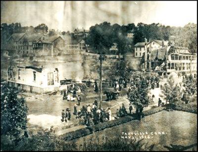 On May 30, 1915 a devastating fire consumed most of Taftville’s commercial district. Both Ponemah Mills’ and Norwich’s fire departments responded, but by the next morning three grocery stores, two butcher shops, a clothing store, a confectionery store, a bakery, a drug store, and a barber shop were all destroyed. The photo shown on the right shows a portion of the tragedy.